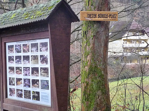 Anlass war die Idee von Jürgen Kunow der Stelle mit der Bildtafel der Fische und Kleinlebewesen in Enz, Nagold und Würm und mit der seit diesem Sommer aufgestellten Sitzbank, einen Namen zu geben. So erfolgte nun die Einweihung des „Dieter Bürkle-Platzes“.